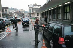 qui tient le passeport suisse imaginaire, de façon détendue.